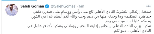 وكتب اللاعب على صفحته الشخصية بموقع التواصل الاجتماعى "تويتر" :"سيظل إرتدائي لتيشرت النادي الأهلي تاج على رأسي ووسام على صدري يكفي جماهيره العظيمة وما وجدته منها من دعم وحب والله أنتم أعظم شئ في الكون وحقكم عليا لو قصرت في يوم "، مضيفا:" شكرا لبيتي النادي الأهلي ومجلس إدارته المحترم وزملائي وشكرا لأصغر عامل في النادي الأهلي .. دعواتكم".