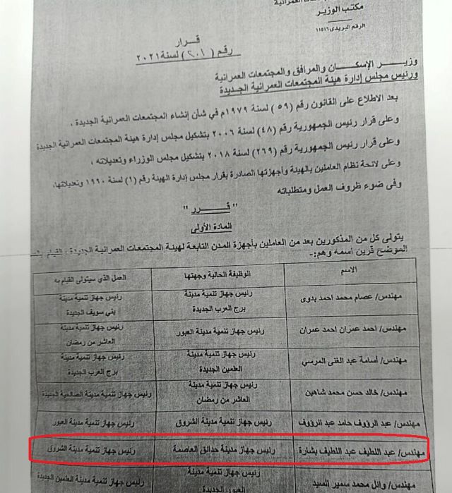 أصدر الدكتور عاصم الجزار، وزير الإسكان والمرافق والمجتمعات العمرانية، قراراً وزارياً برقم (201) لعام (2021) بتكليف، المهندس عبداللطيف بشارة، للعمل رئيساً لـ"جهاز مدينة الشروق"، بـ"محافظة القاهرة"، وجاء ذلك القرار لتحسين مستوى الإدارة فى جهاز المدينة، وتقديم خدمات أفضل للمواطنين فى أحياء المدينة.
