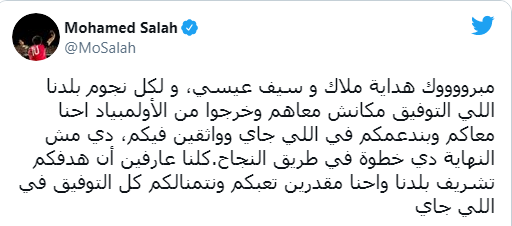 وكتب صلاح عبر حسابه على موقع التواصل الاجتماعي "تويتر": "مبرووووك هداية ملاك وسيف عيسي، ولكل نجوم بلدنا اللي التوفيق مكانش معاهم وخرجوا من الأولمبياد احنا معاكم وبندعمكم في اللي جاي وواثقين فيكم".