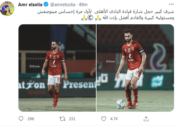 وكتب السولية عبر حسابه الرسمي بموقع التغريدات القصيرة "تويتر": "شرف كبير حمل شارة قيادة النادي الأهلي لأول مرة إحساس ميتوصفش ومسئولية كبيرة والقادم أفضل بإذن الله".