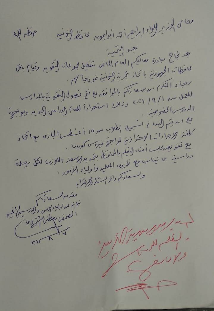 وأعلن المحافظ موافقته على البدء في فتح مجموعات التقوية بالمدارس لمواجهة الدروس الخصوصية, وذلك إبتداءاً من أول سبتمبر المقبل على أن يتم إستقبال الطلبات من 15 أغسطس الجارى مع تطبيق الإجراءات الإحترازية اللازمة للوقاية من فيروس كورونا.