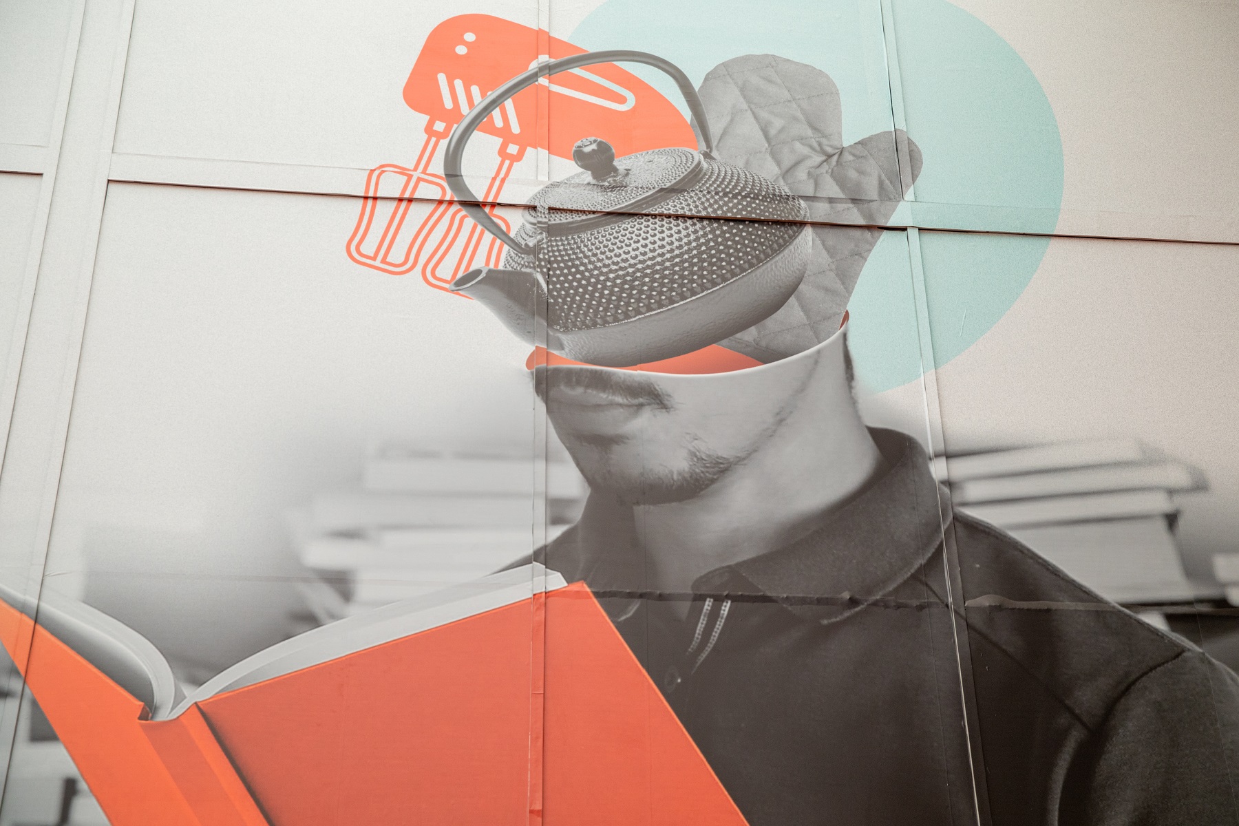 رجل قارئ، ونصف رأسه الأعلى على صورة كاميرا، وفتاة قارئة، ونصف رأسها الأعلى أوعية خاصة بالطبخ، وآخر يقرأ وقد تحوّل نصف رأسه الأعلى إلى كوكب يسبح في عوالم الكون... أفكار تبرز الخطاب من حيز الفكرة المعبر عنها بالكلام، إلى صورة تشير للعين، قبل أن تهمس للأذن، وهي ما يسمو بخطاب معرض الشارقة الدولي للكتاب، المتجدد عاماً بعد عام.