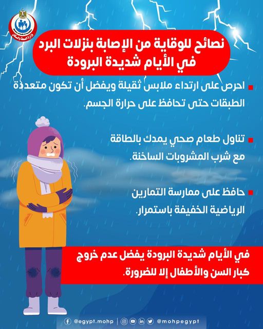 نشرت وزارة الصحة، اليوم الأربعاء، عبر موقعها الرسمى على أحد مواقع التواصل الاجتماعى "فيس بوك" إنفوجرافا يقدم نصائح مهمة للمواطنين للوقاية من نزلات البرد فى الأيام شديدة البرودة.