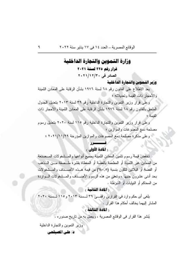 جاء القرار بحسب ما تم نشره بالجريدة الرسمية في مادته الأولى "تخفض قيمة تثمين المعادن الثمينة بجميع أنواعها والمشغولات المصنعة من المعادن غير الثمينة أو المطعمة أو المغطاة بقشرة ملصقة من الذهب أو الفضة أو البلاتين لتكون بنسبة (0.5%) من قيمة هذه الاصناف والمشغولات، بحد أدنى 20جنيهًا، وتعفى من هذه الرسوم الأصناف والمشغولات الواردة من المحاكم أو النيابات أو الشرطة".