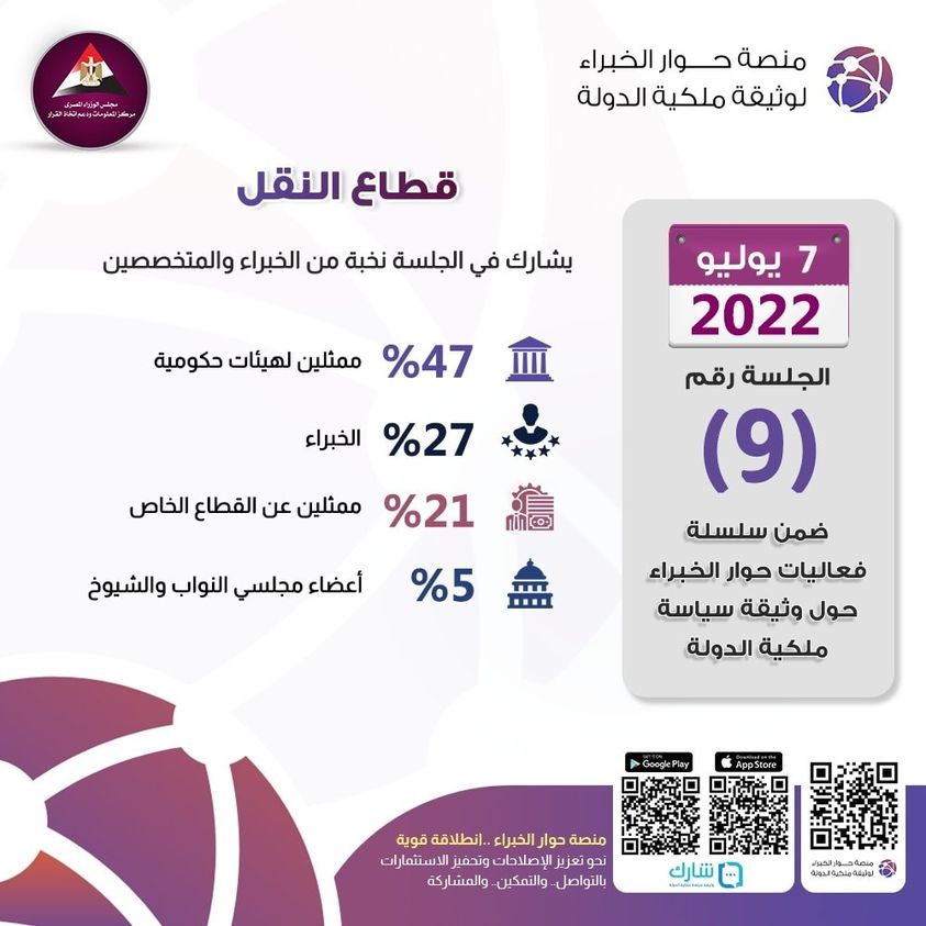 نشر مركز المعلومات ودعم اتخاذ القرار بمجلس الوزراء، اليوم الأربعاء، على صفحته الرسمية عبر أحد مواقع التواصل الاجتماعي "فيس بوك"، إنفوجرافا جديدا يسلط الضوء على تاسع جلسة من "حوار الخبراء" حول وثيقة سياسة ملكية الدولة والخاصة بقطاع النقل غدًا الخميس.