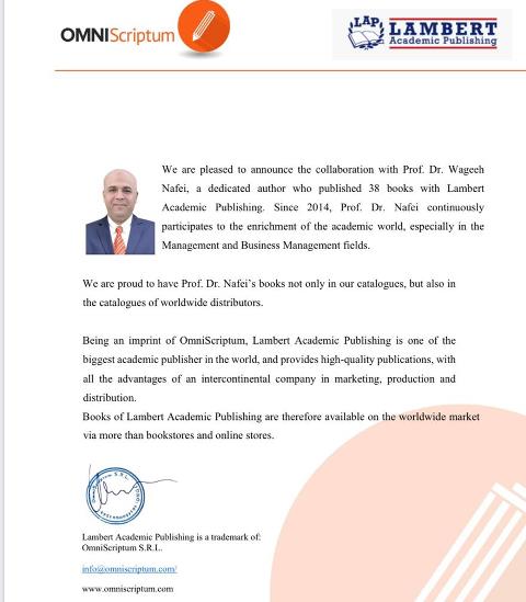 وأفادت LAMBERT أن الدكتور وجيه نافع قد أثرى العالم الأكاديمي بصفة عامة، ومجال إدارة الأعمال بصفة خاصة، كما أشارت أكبر دار نشر في الولايات المتحدة الأمريكية بأنهم فخورين بوجود كتب الدكتور وجيه نافع ليس فقط لديهم، ولكن أيضاً لدى جميع الموزعين فى جميع أنحاء العالم.