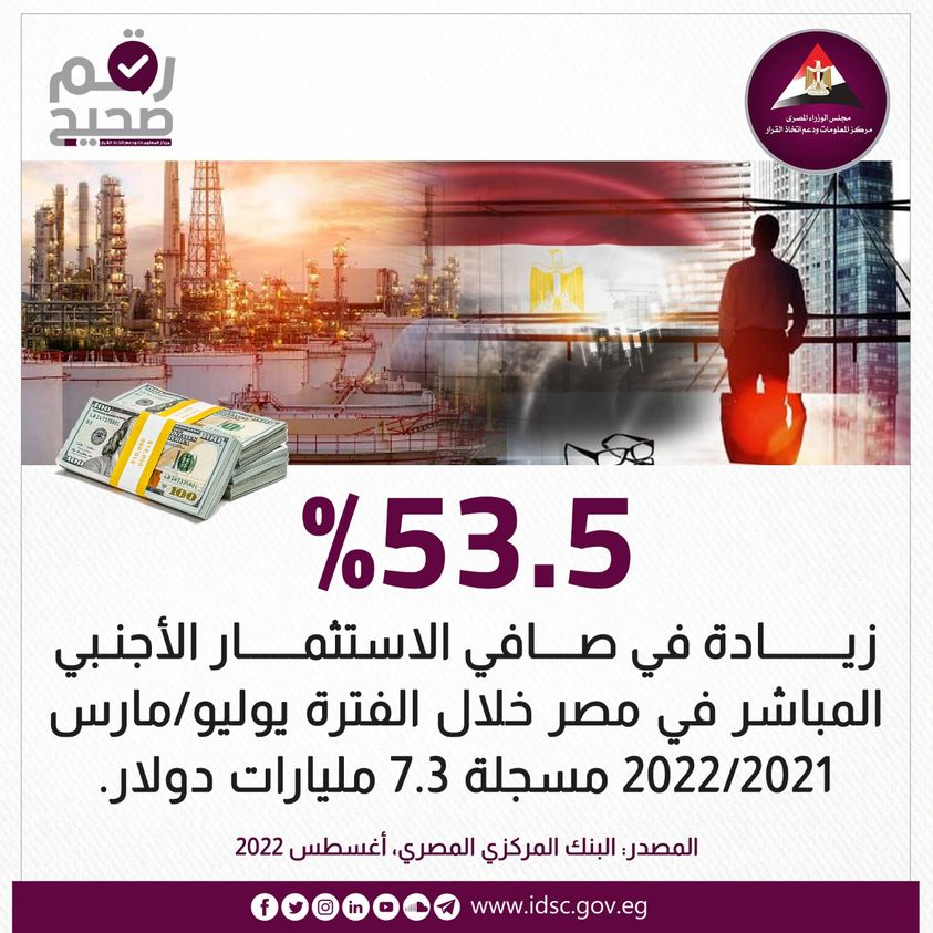 شهد صافي الاستثمار الأجنبي في مصر، ارتفاعًا ملحوظًا بنسبة 53.5% خلال الفترة يوليو/مارس 2021-2022 لتسجل 7.3 مليارات دولار وذلك مقارنة بنحو 4.78 مليارات دولار خلال الفترة نفسها من العام السابق، توزعت الاستثمارات الجديدة بين إنشاء مشروعات جديدة أو زيادة في رأسمال الشركات القائمة بالفعل.