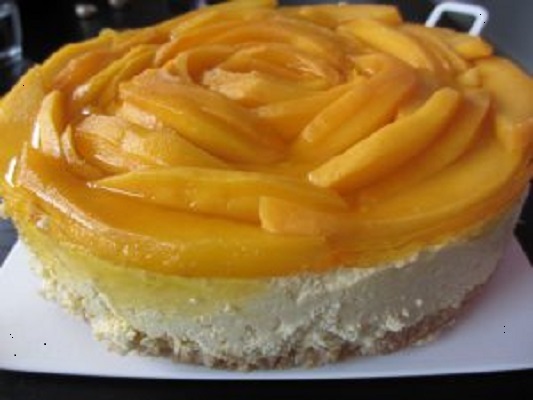 - وزع شرائح المانجو بشكل دائري فوق الحشوة.