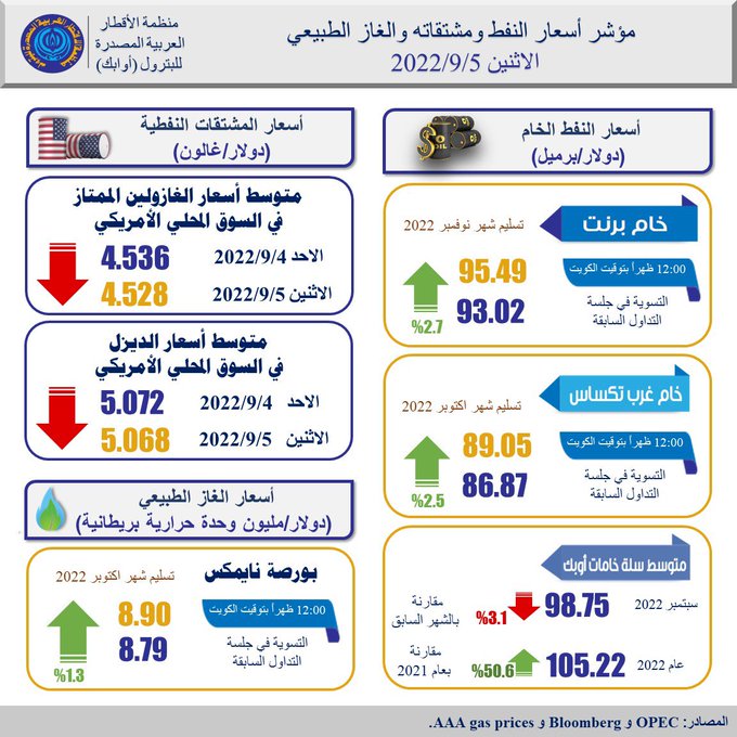 نشرت منظمة الدول العربية المصدرة للبترول "أوابك"، اليوم الإثنين، على صفحتها الرسمية عبر أحد مواقع التواصل الاجتماعي "تويتر"، إنفوجرافا جديدا يسلط الضوء على مؤشرات أسعار النفط ومشتقاته وأسعار الغاز الطبيعى، حيث سجل خام برنت تسليم شهر نوفمبر 95.49 دولار للبرميل، وخام غرب تكساس تسليم شهر أكتوبر 89.05 دولار للبرميل.