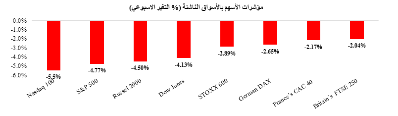 انخفض مؤشر ناسداك المركب للأسهم التكنولوجية الكبرى 5.48%، مسجلاً أيضًا أكبر خسارة أسبوعية له منذ يونيو، وخسر مؤشر داو جونز الصناعي Dow Jones -4.13%.