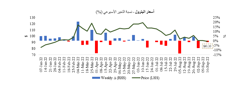 واصلت أسعار النفط انخفاضها للأسبوع الثالث على التوالي وأغلقت على هبوط بنسبة 1.60% لتستقر عند 91.35 دولارًا للبرميل، حيث طغت توقعات التباطؤ الاقتصادي على المخاوف بشأن مخاطر الإمدادات.