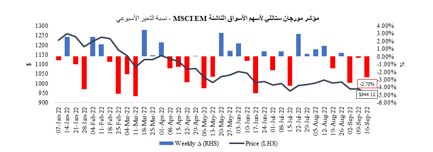 وبالانتقال إلى الأسواق الناشئة، استمرت خسائر مؤشر مورجان ستانلي لأسهم الأسواق الناشئة MSCI EM للأسبوع الثالث على التوالي، حيث تراجع 2.70%، ليستقر عند أدنى مستوى له منذ يوليو 2020. كان الهبوط مدفوعا بالمخاوف المتزايدة بشأن التضخم، وتشديد البنوك المركزية حول العالم لسياساتها النقدية، وتباطؤ النمو الاقتصادي.
