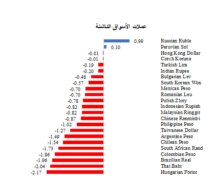 من ناحية أخرى، تفوق الروبل الروسي (+ 0.99%) على أقرانه، وربحت العملة بشكل أساسي يومي الاثنين والثلاثاء مع ترقب الأسواق لقرار السياسة النقدية من البنك المركزي حيث كان من المتوقع خفض أسعار الفائدة بمقدار أقل مقارنة بالأشهر السابقة. وفي يوم الجمعة، خفض البنك المركزي الروسي سعر الفائدة القياسي بمقدار 50 نقطة أساس، وهو ما كان متوقعًا وأشار إلى أنهم يقتربون من نهاية دورة التيسير النقدي، ولم يتغير السول البيروفي (+ 0.10%) تقريبا، حيث سجل معظم أرباحه في يومي الاثنين والجمعة بعد ارتفاع أسعار النحاس، الذي يمثل الصادرات الرئيسية للبلاد.