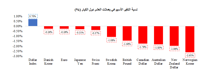 أنهى مؤشر الدولار تداولات الأسبوع على ارتفاع بنسبة 0.70% واستقر عند سعر أقل بقليل من أعلى مستوى له في 20 عامًا والذي وصل إليه خلال تداولات الأسبوع الماضي، حيث واصلت الأسواق تصعيد التكهنات بشأن مسار تشديد بنك الاحتياطي الفيدرالي السياسة النقدية قبل اجتماع اللجنة الفيدرالية للسوق المفتوحة المقرر عقده الأسبوع المقبل.