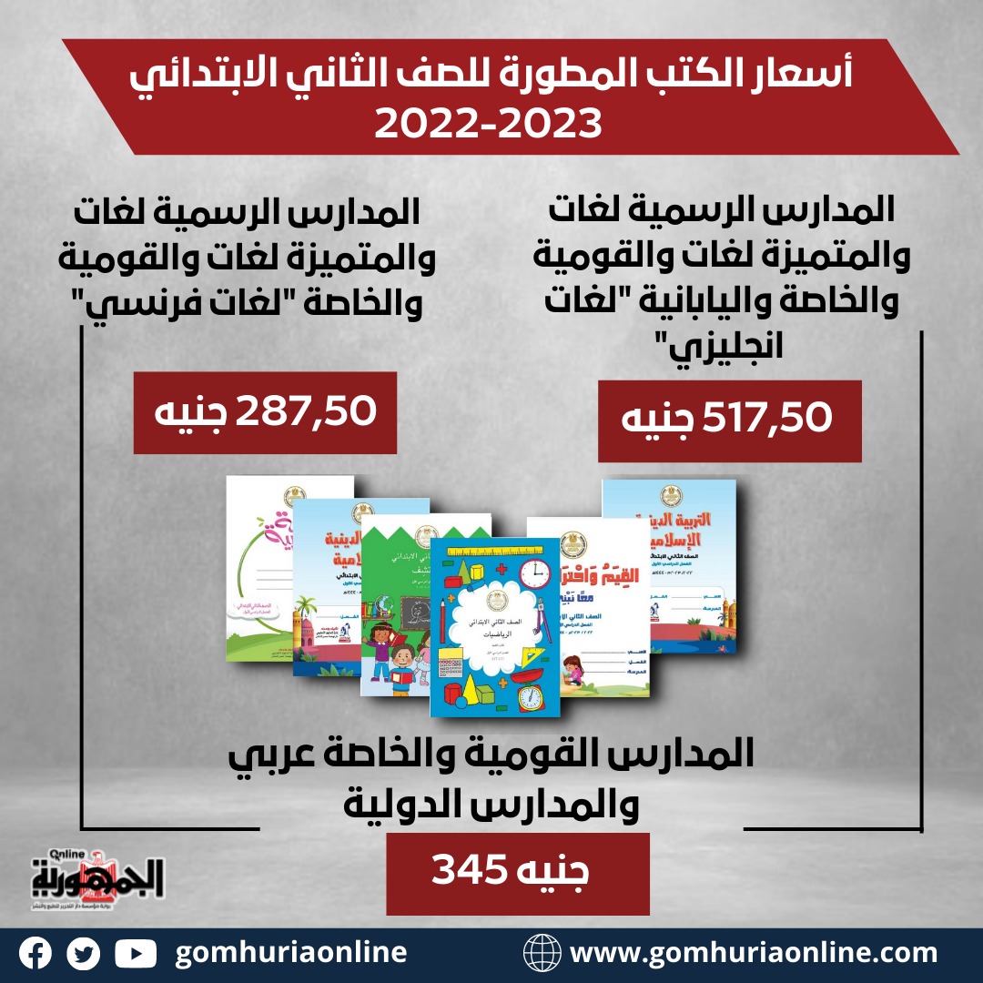وتنشر "الجمهورية أون لاين" أسعار الكتب المطورة لطلاب الصف الثاني الابتدائي بالمدارس الرسمية للغات والرسمية المتميزة لغات والقومية والخاصة واليابانية والدولية كالتالي