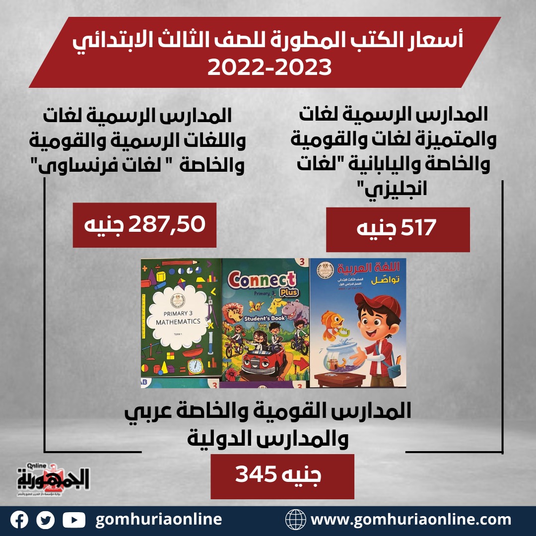 أعلنت وزارة التربية والتعليم والتعليم الفني أسعار الكتب المطورة للصف الثالث الابتدائى كالتالى: