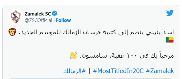 ونشر حساب لزمالك الرسمى عبر موقع التواصل الاجتمناعى "تويتر": "أسد بنيني ينضم إلى كتيبة فرسان الزمالك للموسم الجديد، ومرحباً بك في ١٠٠ عقبة، سامسون".
