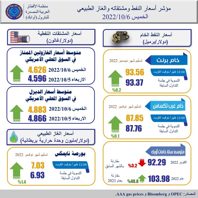 نشرت منظمة الدول العربية المصدرة للبترول "أوابك"، اليوم الخميس، على صفحتها الرسمية عبر أحد مواقع التواصل الاجتماعي "تويتر"، إنفوجرافا جديدا يسلط الضوء على مؤشرات أسعار النفط ومشتقاته وأسعار الغاز الطبيعى، حيث سجل خام برنت تسليم شهر ديسمبر 2022 نحو 93.56 دولار للبرميل، وخام غرب تكساس 87.85 دولار للبرميل.