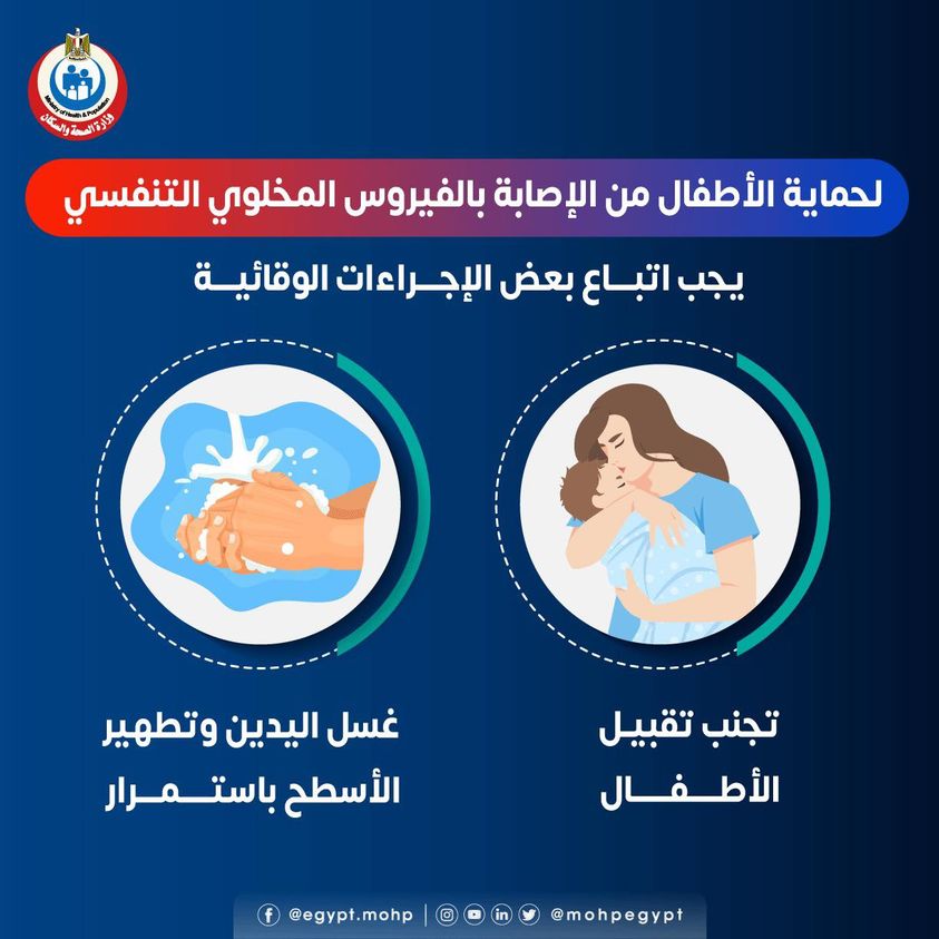 نشرت وزارة الصحة والسكان، اليوم الثلاثاء، على صفحتها الرسمية عبر أحد مواقع التواصل الاجتماعي "فيس بوك" إنفوجرافا جديدا يسلط الضوء على حماية الأطفال من الإصابة بالفيروس المخلوى التنفسى عبر اتباع بعض الإجراءات الوقائية وهي ضرورة عدم تقبيل الأطفال مع غسيل الأيدى باستمرار وتطهير الأسطح للوقاية من الإصابة بعدوى فيروس المخلوى التنفسى.