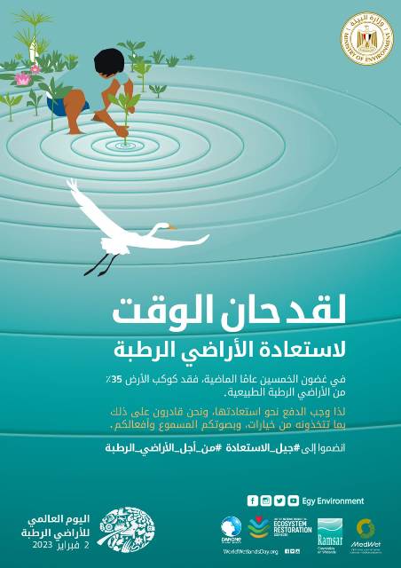 تشارك مصر العالم الاحتفال باليوم العالمي للأراضي الرطبة والذى يوافق ٢ فبراير من كل عام ويحمل هذا العام شعار (إحياء الأراضي الرطبة المتدهورة واستعادتها) وذلك في إشارة إلى أهمية الأراضي الرطبة لبقاء الحياة على كوكب الأرض و التصدى لآثار التغيرات المناخية .