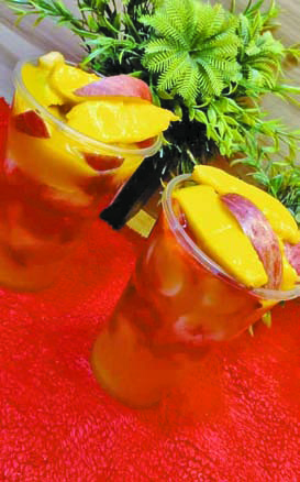 نضع فى الكأس قليل من عصير المانجو ثم نضع فواكه ثم نضع قليل من عصير الفراولة وتزين بالفواكه.