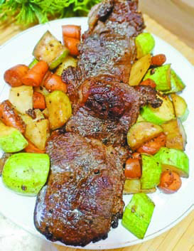 بعد تسوية اللحم نرفعها من على النار ثم ننزل بقطعة اخري من الزبدة في نفس الطاسة او الجريل وننزل عليها بالخضار ويشوح حتي النضج ثم نقدم شرائح اللحم مع الخضار.