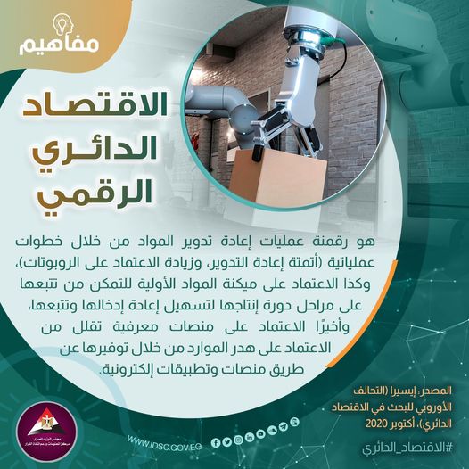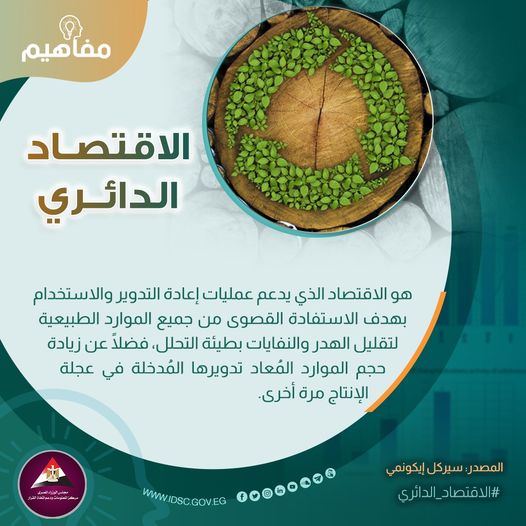 نشر مركز المعلومات ودعم اتخاذ القرار بمجلس الوزراء، اليوم الجمعة، على صفحته الرسمية عبر أحد مواقع التواصل الاجتماعي "فيس بوك"، غنفوجرافا جديدا يسلط الضوء على مفهوم الاقتصاد الدائري، وأهمية الاعتماد على موارد معاد استخدامها للحفاظ على البيئة وموارد الأجيال القادمة.