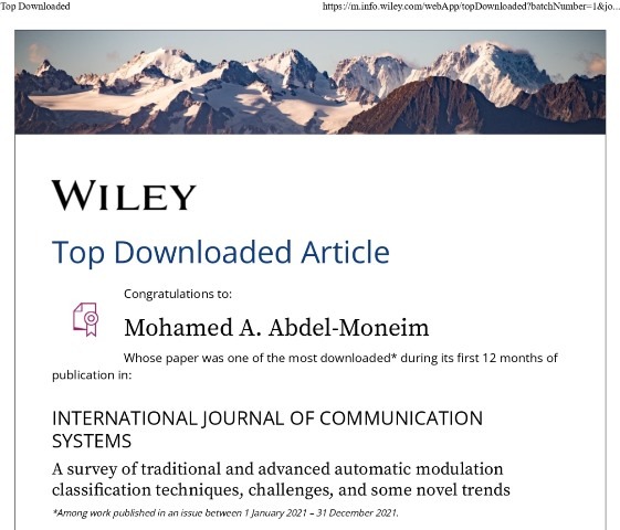 وعنوان البحث "A survey of traditional and advanced automatic modulation classification techniques, challenges, and some novel trends " وفى خلال عام من النشر تم الإعلان أن البحث من بين أكثر الأبحاث عالمياً تحميلا ً فى المجلة وتم الحصول على شهادة بذلك.