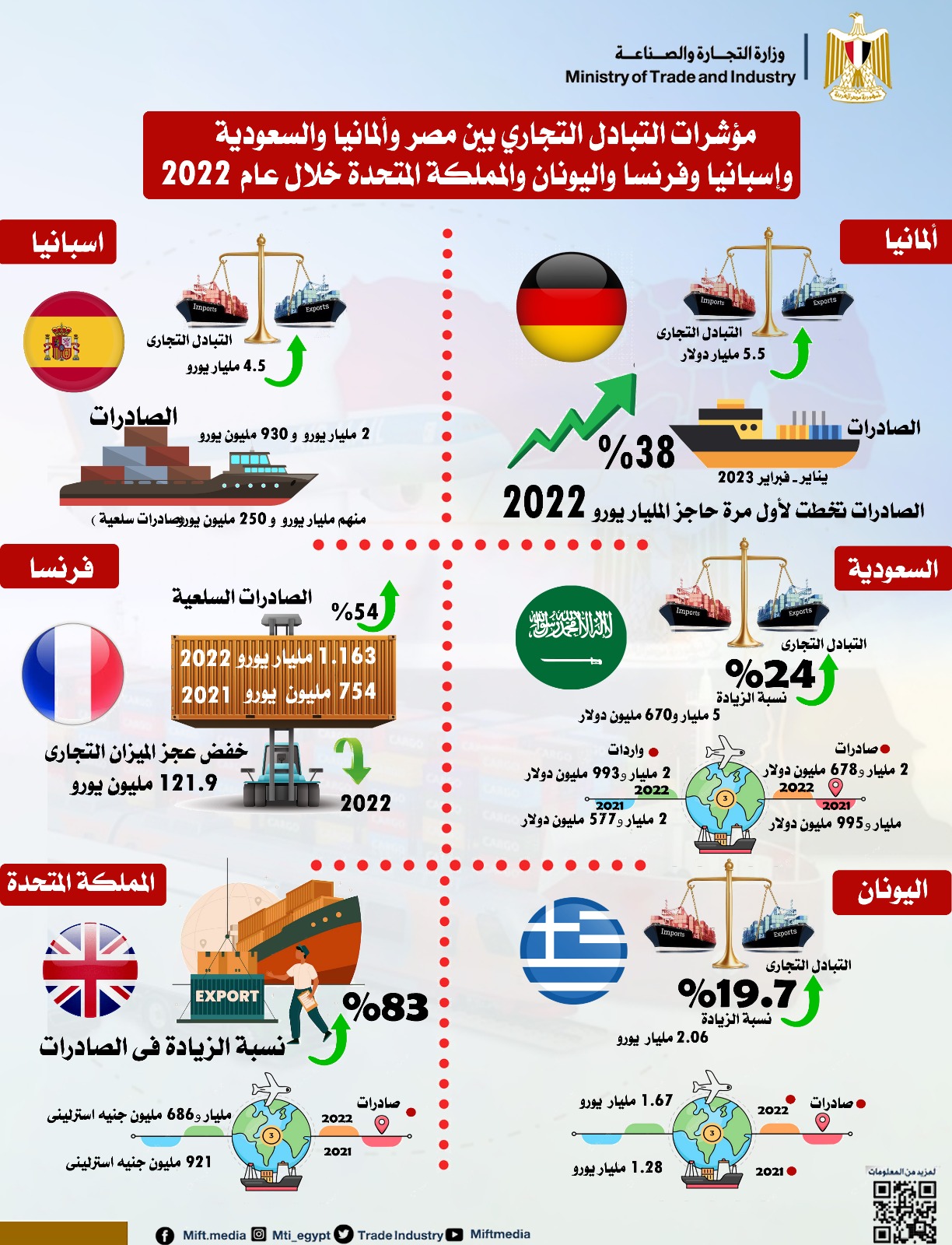 ٥ مليار و٦٧٠ مليون دولار، كما بلغت الصادرات المصرية إلى السوق السعودي ٢ مليار و٦٧٨ مليون دولار مقابل مليار و٩٩٥ مليون دولار خلال عام ٢٠٢١ بنسبة ارتفاع بلغت 34% ، مشيراً إلى أن الواردات السلعية المصرية من السعودية ارتفعت بنسبة ١٦% حيث بلغت ٢ مليار و٩٩٣ مليون دولار عام ٢٠٢٢ مقارنة بنحو ٢ مليار و٥٧٧ مليون دولار خلال عام ٢٠٢١.