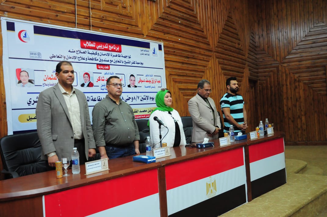 فى إطار تنفيذ خطة الدولة، بالجامعات المصرية لمواجهه ظاهره ادمان وتعاطي المخدرات، قامت جامعه كفر الشيخ ممثله في قطاع خدمة المجتمع وتنمية البيئة بتنفيذ العديد من الفاعليات منها الدورات التدريبية للطلاب ليكونوا سفراء للجامعة في نشر الوعي داخل كليات الجامعة، بالتعاون والتنسيق مع صندوق مكافحة وعلاج الإدمان والتعاطي، تحت رعايه الدكتور عبدالرازق دسوقي رئيس الجامعة، والدكتور اماني شاكر نائب رئيس الجامعة لشئون خدمة المجتمع وتنمية البيئة.