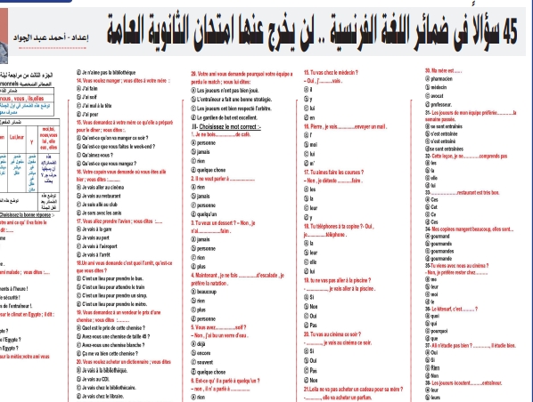مراجعات نهائيه .. الخلطة السحرية في اللغة الفرنسية الثانوية العامة 2024.. تقدم بوابة الجمهورية أونلاين، خدمة مميزة لطلاب وطالبات الثانوية العامة ، للعام الدراسى الحالى 2023-2024، من الملحق التعليمي من جريدة المساء ، وذلك من خلال روشتة التفوق وصناعة الأوائل، وضمان الحصول على 100% من خلال استعراض الخلطة السحرية في اللغة الفرنسية، لن يخرج عنها الامتحان.