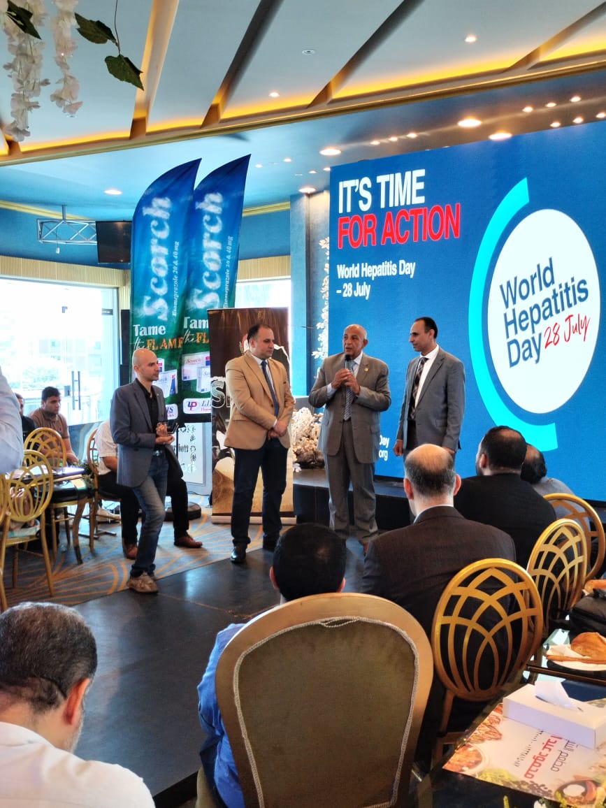 رحب الدكتور هاني جميعة خلال كلمته بجميع الحضور، مشيراً إلى أهمية الاحتفال باليوم العالمي لالتهاب الكبد، وما حققته الدولة المصرية من خلال المبادرات الرئاسية من القضاء على فيروس سي، وحصول مصر كأول دولة في العالم على "المستوى الذهبي" على مسار القضاء على التهاب الكبد C، من منظمة الصحة العالمية، وذلك بعد أن أوفت مصر بالمتطلبات التي أدت إلى خفض حالات العدوى والوفيات إلى المستويات التي تؤهلها للقضاء على هذا المرض، لافتاً إلى أن هذا الإشهاد الذي تحقق في زمن قياسي، بعد فحص أكثر من ٦٠ مليون مواطن، وعلاج أكثر من ٢ مليون من هذا المرض، وتوفير العلاج اللازم لهم بأيدي مصرية، يعد قصة نجاح عالمية يحتذى بها، وأعظم انتصار للدولة المصرية، بعد حرب أكتوبر ١٩٧٣.