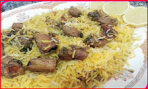 نصف كيلو صدور فراخ مقطعة مكعبات. طماطماية مقطعة. بصلة مفرومة وجنزبيل وحبة فلفل أخضر/ وفص ثوم مفروم. عود قرفة وبهارات برياني وكاري/ زيت وأرز بسمتي وملح و زبيب وماء الورد. كسبرة خضراء مفرومة وحبهان وزعفران. كمون حب وليمون اضاليا للتزيين.