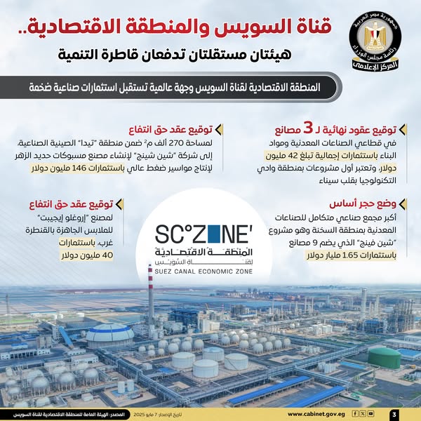 وفيما يتعلق بالهيئة العامة للمنطقة الاقتصادية لقناة السويس، فقد أشارت الإنفوجرافات إلى أنه تم إنشاء المنطقة الاقتصادية لتمثل منطقة حرة ومركزًا تجاريًا عالميًا على ضفاف قناة السويس، مع دورها المحوري في جذب الاستثمارات، وتوطين الصناعات، وخلق فرص عمل مستدامة، ويتم إدارتها من قبل الهيئة العامة للمنطقة الاقتصادية لقناة السويس.