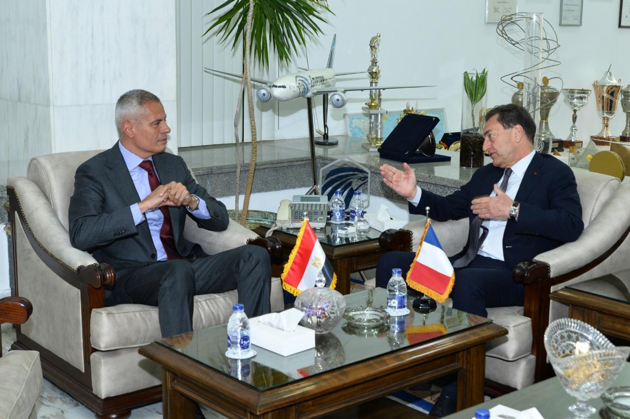 إستقبل الطيار أحمد عادل رئيس الشركة القابضة لمصر للطيران، "إيريك شوفالييه" سفير فرنسا لدى مصر والوفد المرافق له، وذلك لبحث سبل تعزيز التعاون المشترك بين الجانبين في مجال الطيران المدنى.