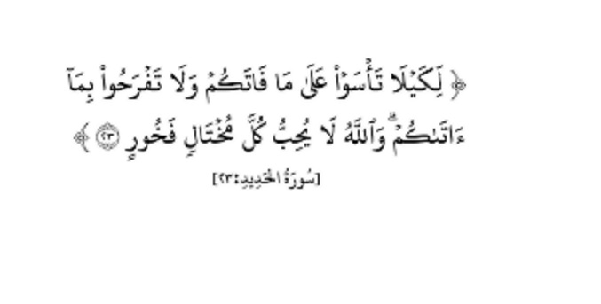 "لِّكَيْلَا تَأْسَوْا عَلَىٰ مَا فَاتَكُمْ وَلَا تَفْرَحُوا بِمَا آتَاكُمْ ۗ وَاللَّهُ لَا يُحِبُّ كُلَّ مُخْتَالٍ فَخُورٍ" سورة الحديد،