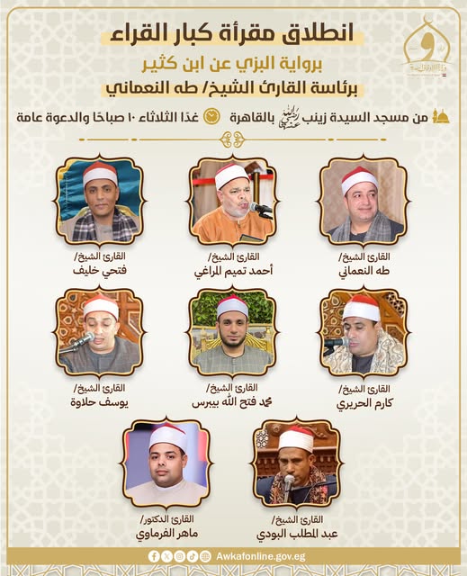 في إطار اهتمام وزارة الأوقاف بالقرآن الكريم، تُعقد مقرأة كبار القراء برواية البزي عن ابن كثير من طريق الشاطبية اليوم الثلاثاء فى تمام الساعة العاشرة صباحًا الموافق 29/ 7 /2025 م برئاسة الشيخ/ طه النعماني وعضوية كل من السادة القراء: