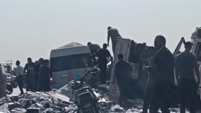 انتقلت على الفور الأجهزة الأمنية وبالفحص تبين تصادم بين السيارتين وانقلاب حمولة السيارة النقل.