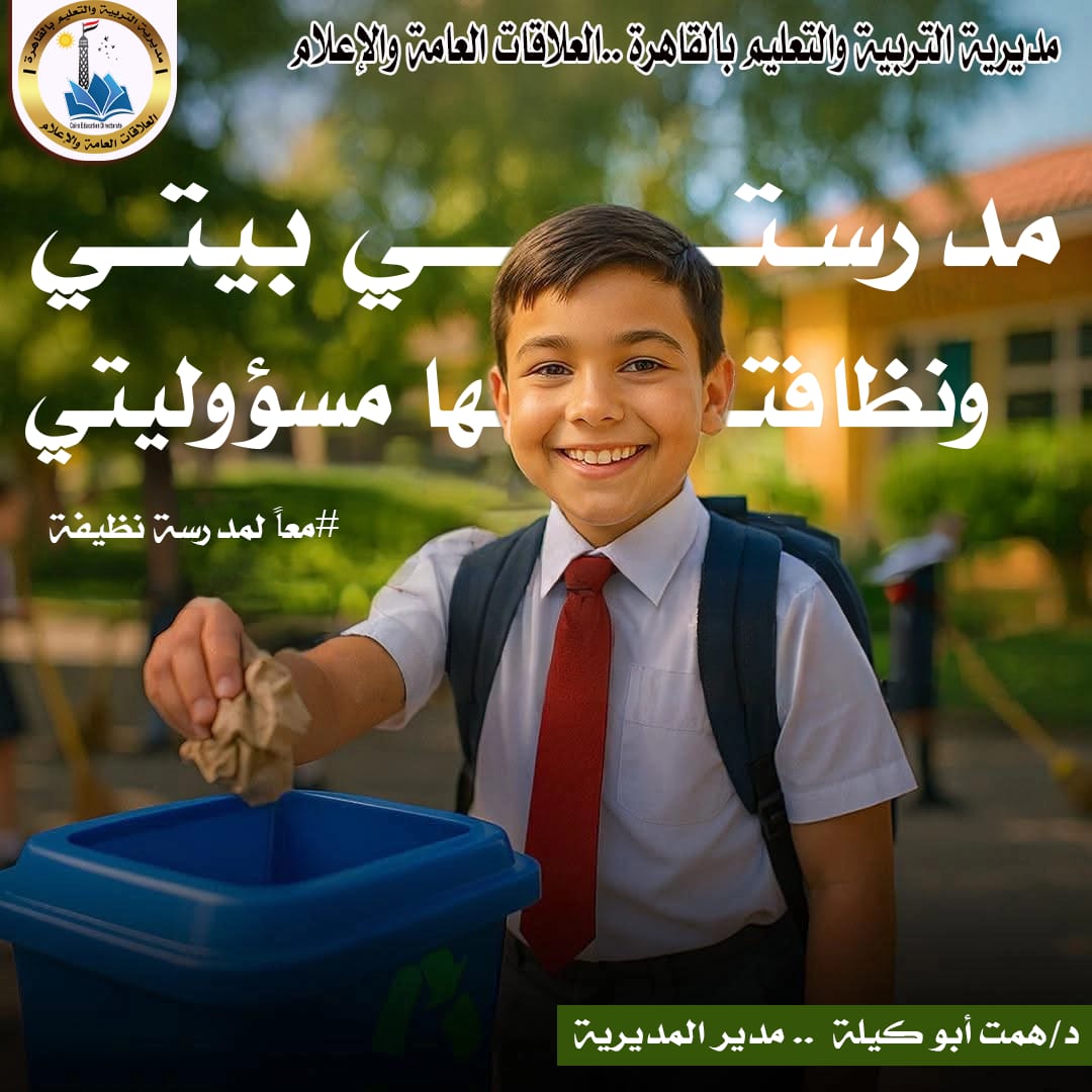 تدعو مديرية التربية والتعليم بالقاهرة برعاية الدكتورة/ همت أبوكيلة مدير مديرية التربية والتعليم بالقاهرة جميع طلابها الأعزاء للحفاظ على نظافة مدارسهم والمساهمة في جعل الفصول والطرقات خالية من القمامة.