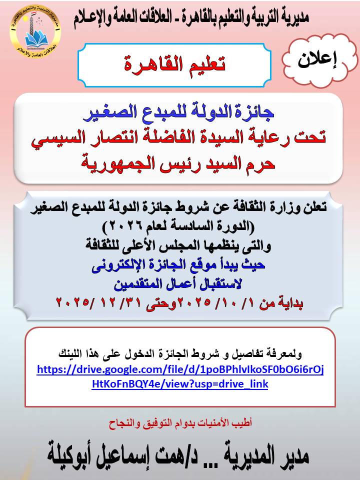 تحت رعاية السيدة الفاضلة انتصار السيسي حرم السيد رئيس الجمهورية تعلن وزارة الثقافة عن شروط جائزة الدولة للمبدع الصغير (الدورة السادسة لعام 2026) والتى ينظمها المجلس الأعلى للثقافة