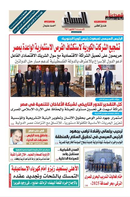 وعلى صفحات المساء نقرأ أيضا، ختام فعاليات التدريب البحري المشترك المصرى التركي بحر الصداقة ٢٠٢٥ ،وضوابط الحج السياحى الجديدة لا تزال قيد المناقشات ، وتقييم ميداني للمنشأت الصحية استعدادا لتطبيق التأمين الصحي الشامل بالمنيا ، ورسوم وقائية مؤقتة على واردات الصلب لحماية الصناعة المحلية في مصر .