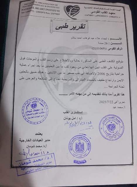 "الامل في الجراحة الثانية" شيماء علاء عبدالوهاب فتاه في السادسة من عمرها وعيت علي الدنيا لتجد نفسها يتيمة الأب وامها تعمل جاهدة لتوفير حياة مستقرة لها واخواتها اكتشفت إصابتها بمشكلة معقدة بالقلب وقطعت رحلة علاج دوائي طويلة دون أن تتحسن حالتها وكان التدخل الجراحي القرار الوحيد المتبقي أجرت عملية قلب مفتوح لاستبدال الصمام المتيرالي وبعد عدة شهور بدات حالتها تستقر وقررت الخروج للعمل لتشارك والدتها المسؤوليه بعد أن تحملت مالاتطيق من نفقات زواج شقيقاتها اشتغلت في محل ملابس وبدأت تشارك في نفقات البيت وفجأة بدأت تشعر بآلام متكررة بالصدر وعادت للمتابعة في معهد القلب واثبتت الفحوص اصابتها بثقب ما بين الاذيني وضيق بالبطاين الايمن وارتجاع بالصمام الميترالي وتقررلها جراحة جديدة طلبوا منها فحوص عديدة بعضها في المعهد وبعضها خارج المعهد علي نفقتها تعثرت الام أمام النفقات الكثيرة الباهظة وبعثت لنا تطلب الوقوف معها حتي تكمل الفحوص المطلوبة وتجري الجراحة المقررة لابنتها وتطمئن عليها.
