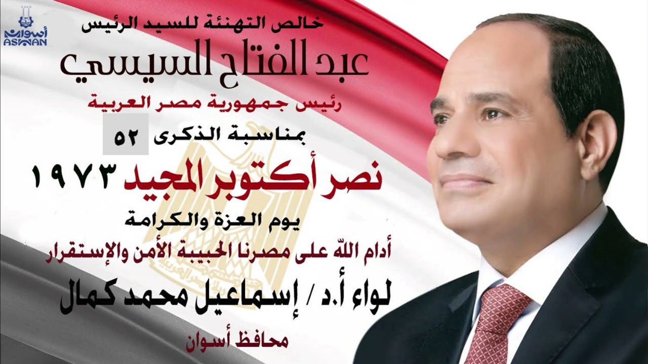 بعث اللواء دكتور إسماعيل كمال محافظ أسوان ببرقية تهنئة إلى الرئيس عبد الفتاح السيسى رئيس الجمهورية القائد الأعلى للقوات المسلحة بمناسبة الإحتفال بالذكرى الـ 52 لإنتصارات أكتوبر المجيدة ، وأكد الدكتور إسماعيل كمال فى برقيته بأنه بالأصالة عن نفسى وبالإنابة عن أبناء محافظة أسوان والقيادات التنفيذية والبرلمانية والسياسية يسعدنى أن أبعث لسيادتكم بخالص التهنئة بمناسبة الإحتفال بملحمة نصر أكتوبر العظيم ، لتظل هذه الذكرى خالدة فى تاريخنا الوطنى ، ومبعث إعتزاز وفخر لشعب مصر بقواته المسلحة ورجالها الأوفياء