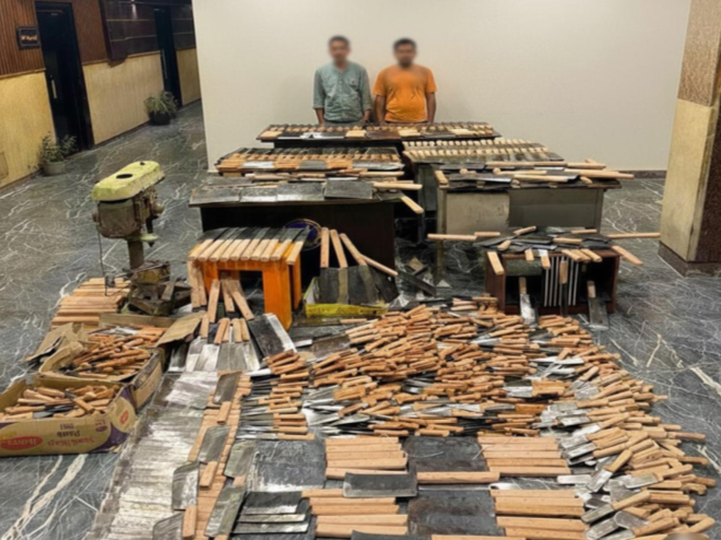 تم إستهدافهما وأمكن ضبطهما ، وبحوزتهما (1205 قطعة سلاح أبيض "مختلفة الأشكال والأنواع" – الأدوات والمعدات المستخدمة فى التصنيع) ، وبمواجهتهما إعترفا بإرتكاب الواقعة على النحو المشار إليه.