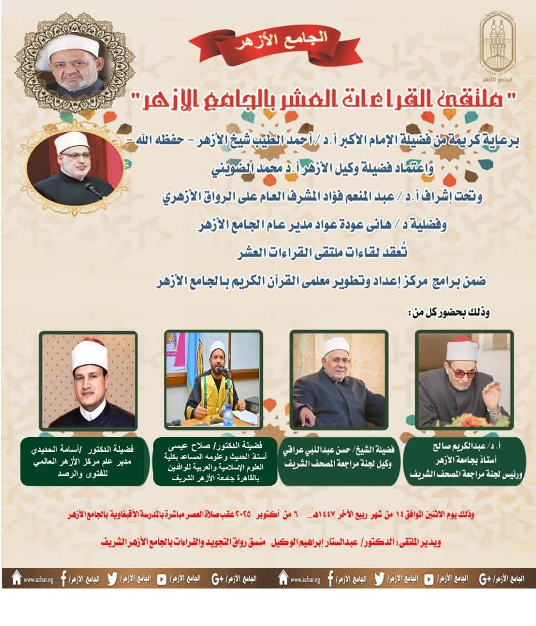 وصرح أ.د عبد المنعم فؤاد المشرف العام على الأنشطة العلمية للرواق الأزهري بالجامع الأزهر، أن هذا البرنامج يأتي ضمن سلسلة من الأنشطة والبرامج التي ينظمها مركز إعداد وتطوير معلمي القرآن الكريم بالجامع الأزهر، ويهدف إلى قراءة القرآن الكريم كاملاً بالقراءات الثلاثة المتممة للعشر، بواقع نصف جزء يومياً، مع تقديم شرح مفصل للتلاوة وتعريف بأصول القراء ومذاهبهم، كما سيتناول الملتقى التنبيه على الكلمات الفرشية المختلف فيها بين القراء، مما يسهم في تعزيز الفهم العميق للقراءات العشر المتواترة ورفع مستوى التلاوة بين المشاركين.
