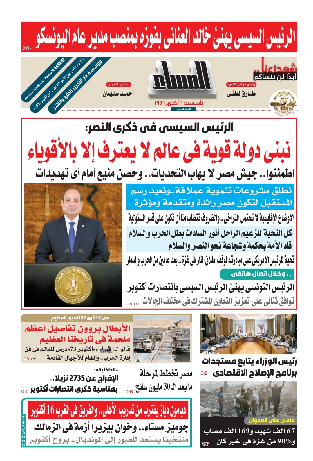 .. وتقرأ أيضاً : أبطال النصر يروون ل"المساء"سر النجاح والتفوق في أكتوبر 73 حيث أكدوا أن ملحمة أكتوبر درس للعالم فى فن إدارة الحرب وإلهام للأجيال القادمة.
