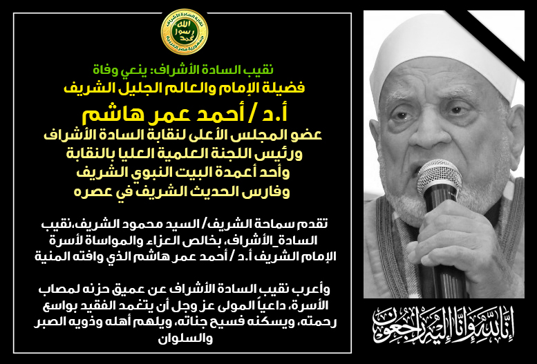 نعت نقابة السادة الأشراف وفاة فقيدنا الجليل الإمام الشريف الأستاذ الدكتور/ أحمد عمر هاشم عضو المجلس الأعلى لنقابة السادة الأشراف،ورئيس اللجنة العلمية العليا بالنقابة،وأحد أعمدة البيت النبوي الشريف، وفارس الحديث الشريف في عصره.