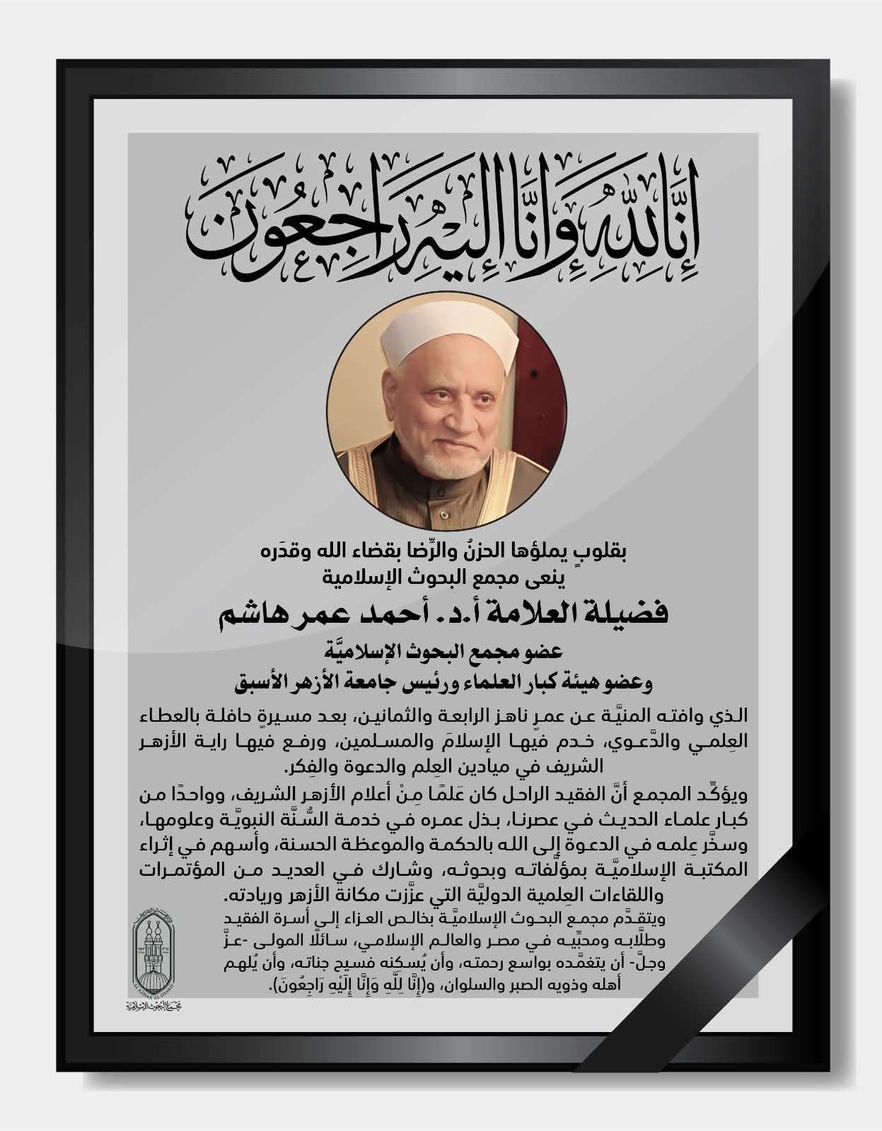 ينعى #مجمع_البحوث_الإسلامية بقلوبٍ يملؤها الحزنُ والرِّضا بقضاء الله وقدَره، فضيلةَ العلَّامة أ.د. أحمد عمر هاشم، عضو مجمع البحوث الإسلاميَّة وعضو هيئة كبار العلماء ورئيس جامعة الأزهر الأسبق، الذي وافته المنيَّة عن عمرٍ ناهز الرابعة والثمانين، بعد مسيرةٍ حافلة بالعطاء العِلمي والدَّعوي، خدم فيها الإسلامَ والمسلمين، ورفع فيها راية الأزهر الشريف في ميادين العِلم والدعوة والفِكر.