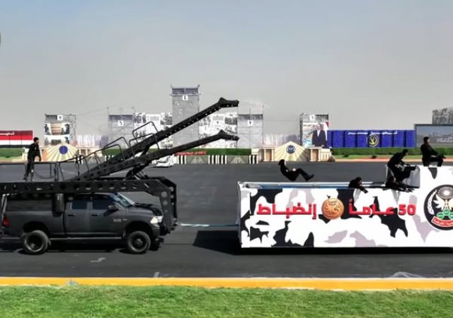 وفي الوقت نفسه ، قامت وحدتان من الطلبة بأداء تدريبات التعلق والعقلة ، كما قامت مجموعة أخرى بأداء تمارين البطن الهوائية، ثم بدأت عروض ميدان الجبال ، حيث قام الطلبة بالنزول من أعلى الأبراج عبر حبال "الهارنس" بأوضاع المختلفة ، كما نزل مجموعة أخرى من الطلبة بمواجهة الأرض في وضع الاشتباك وهي مهارات تستخدم في أرض العمليات.