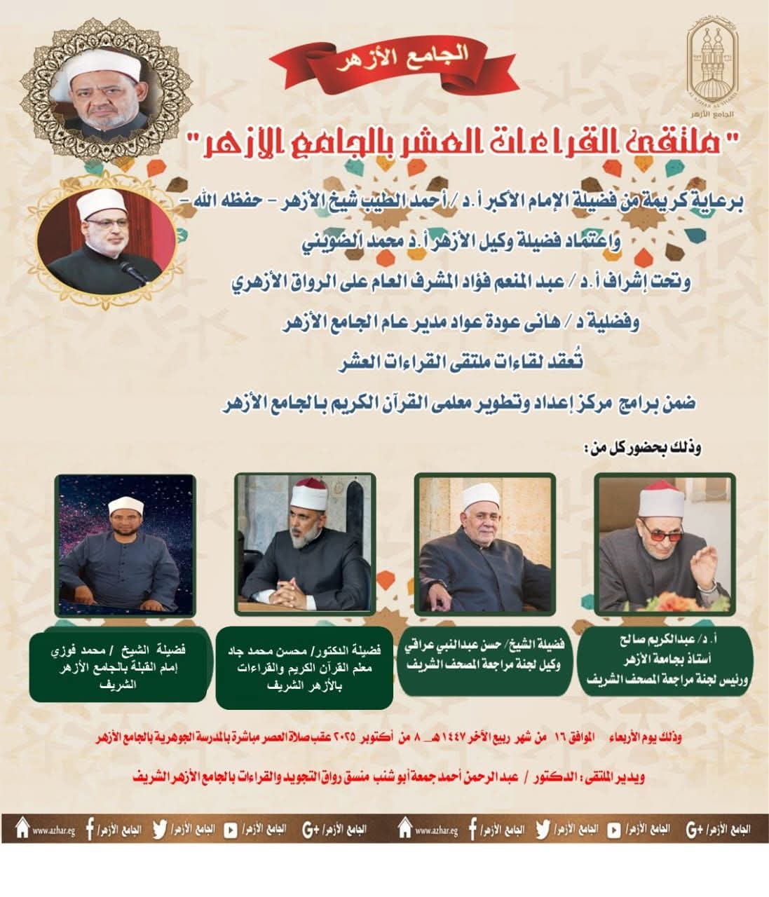 وصرح أ.د عبد المنعم فؤاد المشرف العام على الأنشطة العلمية للرواق الأزهري بالجامع الأزهر، أن هذا البرنامج يأتي ضمن سلسلة من الأنشطة والبرامج التي ينظمها مركز إعداد وتطوير معلمي القرآن الكريم بالجامع الأزهر، ويهدف إلى قراءة القرآن الكريم كاملاً بالقراءات الثلاثة المتممة للعشر، بواقع نصف جزء يومياً، مع تقديم شرح مفصل للتلاوة وتعريف بأصول القراء ومذاهبهم، كما سيتناول الملتقى التنبيه على الكلمات الفرشية المختلف فيها بين القراء، مما يسهم في تعزيز الفهم العميق للقراءات العشر المتواترة ورفع مستوى التلاوة بين المشاركين.
